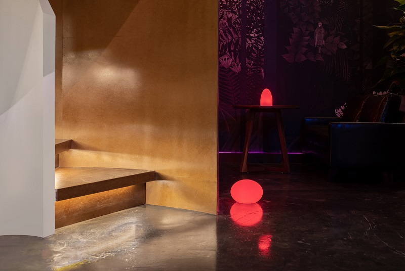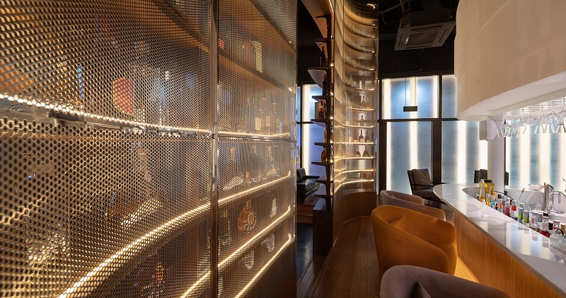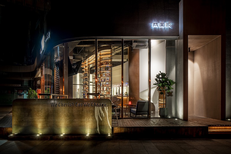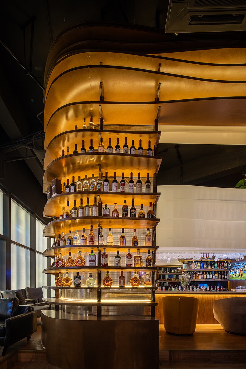 由于面積局限,將落體玻璃設(shè)計(jì)成高5米的戶型酒架,不但界定出來(lái)酒吧的前后場(chǎng)地區(qū)域,還充當(dāng)儲(chǔ)物展示作用,最大限度地提升空間使用率,穿孔不銹鋼鏡面提高了空間通透感。在這里,你可以盡情的釋放自我,打開(kāi)內(nèi)心的藩籬、摘掉日常的面具,“移步換景”后,興許你還能碰到另一個(gè)久違的自己。